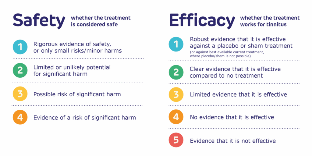 Efficacy: whether there is evidence that the treatment works for tinnitus, ranging from robust evidence of effectiveness to evidence that it is not effective.