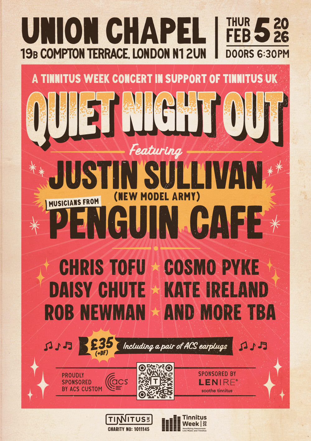 Join us for Quiet Night Out, a special evening of music, spoken word, comedy and connection created with safe listening at its heart, in support of Tinnitus UK, kindly sponsored by ACS Custom and Lenire. Hosted during Tinnitus Week (2 – 8 February 2026) in the iconic setting of London’s Union Chapel, this concert brings together an eclectic line-up presented at carefully managed sound levels designed to be comfortable for people living with tinnitus or sound sensitivity.